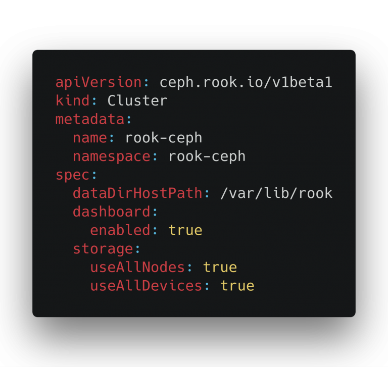 Not going into too much details about the example Rook Ceph Cluster object here, it will instruct the Rook Ceph operator to use all nodes in your cluster as long as they are applicable (don’t have taints and/or other "restrictions" on them). For each applicable node it will try to use all empty devices and store configs and some state data in the dataDirHostPath: /var/lib/rook.